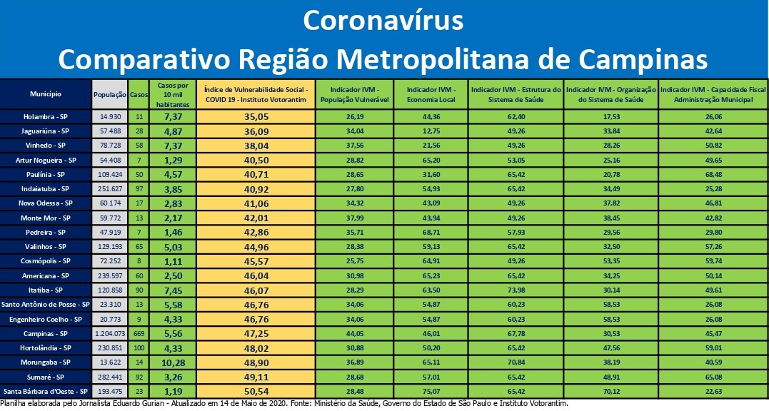 Região Metropolitana de Campinas – Coronavírus – Atualização dos dados em 15.05.2020