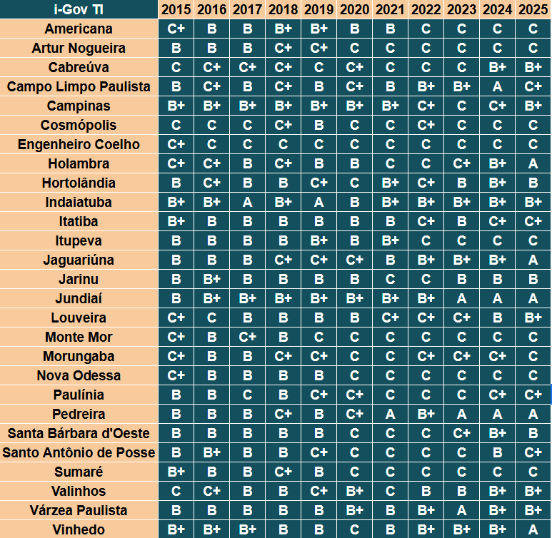 A ferramenta, criada pelo Tribunal em 2015 e ideializada pelo Conselheiro Sidney Beraldo, mede o grau de efetividade das políticas públicas municipais a partir de sete dimensões temáticas: Planejamento, Fiscal, Educação, Saúde, Meio Ambiente, Cidades Protegidas e Governança em Tecnologia da Informação. As notas vão de “A” (altamente efetiva) a “C” (baixo nível de efetividade).